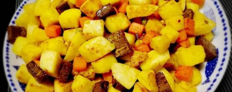 5、油烧热,放入蒜苗和葱炒香,放入拌好的馍丁,到锅里时不要立马翻炒,不然容易碎掉。