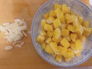 4、锅中倒油,油热倒入拌好的馍馍翻炒,翻炒一分钟倒入葱花,加入少许盐,继续小火翻炒至金黄即可。