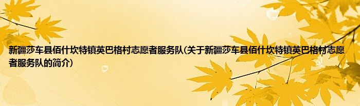 1、 新疆莎车县佰什坎特镇英巴格村志愿者服务队是由莎车县佰什坎特镇志愿服务队领导下的志愿团体。